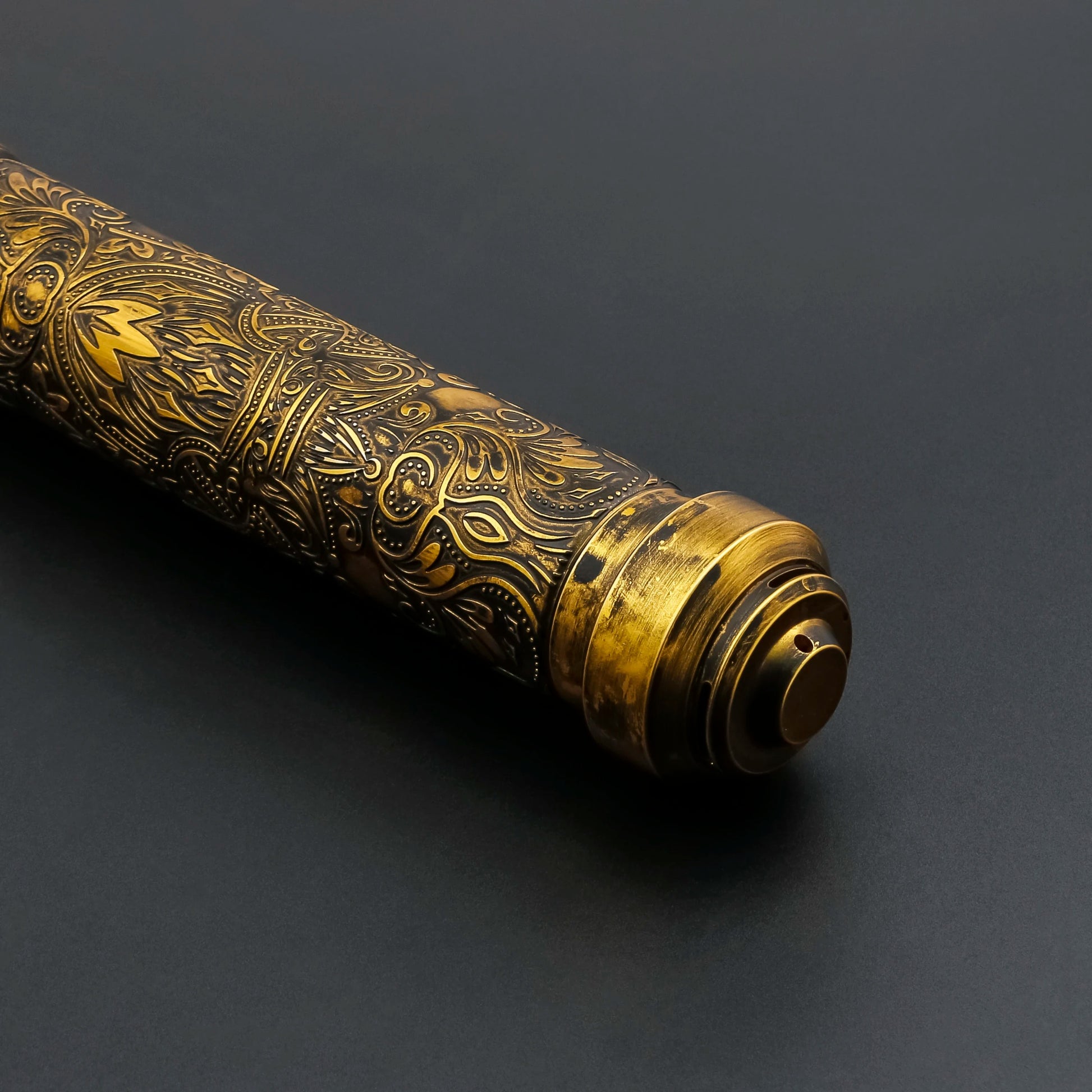From the textured grip to the metal accents, this hilt is made to look amazing on your desk or in your hand.